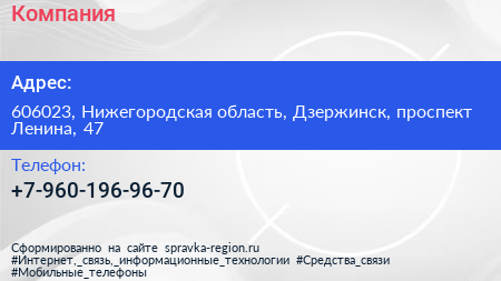 Компания по адресу 606023, Нижегородская область, Дзержинск, проспект Ленина, 47 в дальнейшем Организация, размещена в следующих категориях: