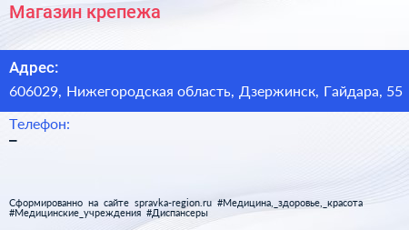 Магазин крепежа по адресу 606029, Нижегородская область, Дзержинск, Гайдара, 55 в дальнейшем Организация, размещена в следующих категориях: