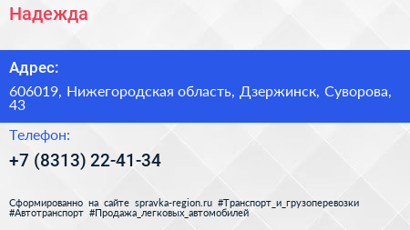 Надежда по адресу 606019, Нижегородская область, Дзержинск, Суворова, 43 в дальнейшем Организация, размещена в следующих категориях: