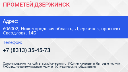 ПРОМЕТЕЙ ДЗЕРЖИНСК по адресу 606002, Нижегородская область, Дзержинск, проспект Свердлова, 14Б в дальнейшем Организация, размещена в следующих категориях: