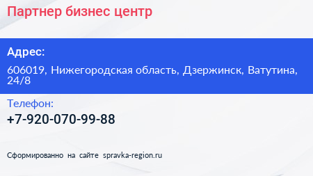 Партнер, бизнес-центр по адресу 606019, Нижегородская область, Дзержинск, Ватутина, 24/8 в дальнейшем Организация, размещена в следующих категориях: