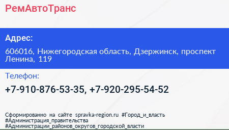 РемАвтоТранс по адресу 606016, Нижегородская область, Дзержинск, проспект Ленина, 119 в дальнейшем Организация, размещена в следующих категориях: