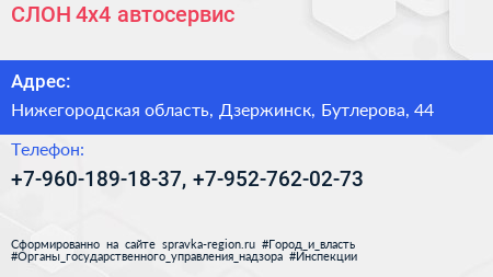 СЛОН 4х4, автосервис по адресу Нижегородская область, Дзержинск, Бутлерова, 44 в дальнейшем Организация, размещена в следующих категориях: