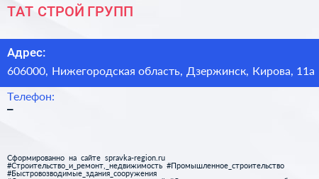 ТАТ-СТРОЙ ГРУПП по адресу 606000, Нижегородская область, Дзержинск, Кирова, 11а в дальнейшем Организация, размещена в следующих категориях: