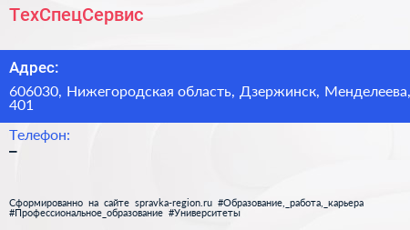 ТехСпецСервис по адресу 606030, Нижегородская область, Дзержинск, Менделеева, 401 в дальнейшем Организация, размещена в следующих категориях: