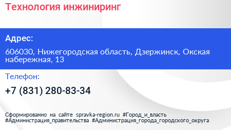Технология инжиниринг по адресу 606030, Нижегородская область, Дзержинск, Окская набережная, 13 в дальнейшем Организация, размещена в следующих категориях: