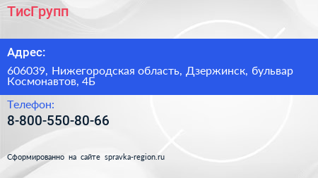 ТисГрупп по адресу 606039, Нижегородская область, Дзержинск, бульвар Космонавтов, 4Б в дальнейшем Организация, размещена в следующих категориях: