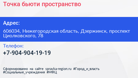 Точка, бьюти пространство по адресу 606034, Нижегородская область, Дзержинск, проспект Циолковского, 78 в дальнейшем Организация, размещена в следующих категориях: