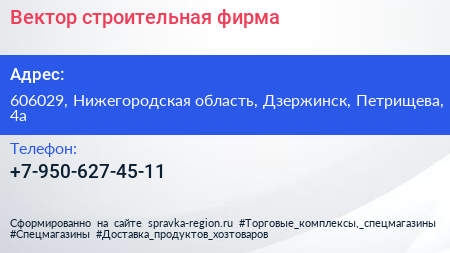 Вектор, строительная фирма по адресу 606029, Нижегородская область, Дзержинск, Петрищева, 4а в дальнейшем Организация, размещена в следующих категориях: