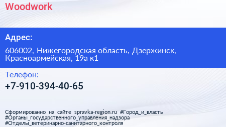 Woodwork по адресу 606002, Нижегородская область, Дзержинск, Красноармейская, 19а к1 в дальнейшем Организация, размещена в следующих категориях: