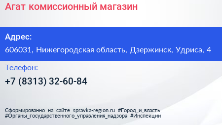 Агат, комиссионный магазин по адресу 606031, Нижегородская область, Дзержинск, Удриса, 4 в дальнейшем Организация, размещена в следующих категориях: