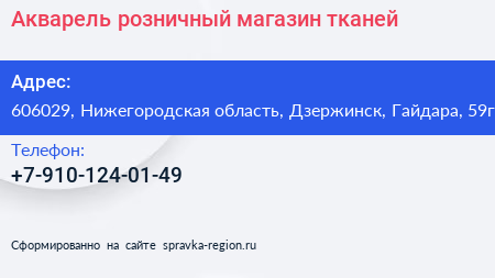 Акварель, розничный магазин тканей по адресу 606029, Нижегородская область, Дзержинск, Гайдара, 59г в дальнейшем Организация, размещена в следующих категориях: