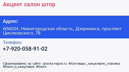Акцент, салон штор по адресу 606034, Нижегородская область, Дзержинск, проспект Циолковского, 78 в дальнейшем Организация, размещена в следующих категориях: