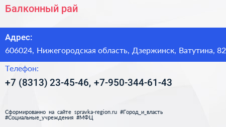 Балконный рай по адресу 606024, Нижегородская область, Дзержинск, Ватутина, 82 в дальнейшем Организация, размещена в следующих категориях: