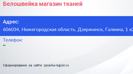Белошвейка, магазин тканей по адресу 606034, Нижегородская область, Дзержинск, Галкина, 1 к2 в дальнейшем Организация, размещена в следующих категориях: