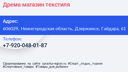 Дрема, магазин текстиля по адресу 606029, Нижегородская область, Дзержинск, Гайдара, 61 в дальнейшем Организация, размещена в следующих категориях: