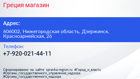 Греция, магазин по адресу 606002, Нижегородская область, Дзержинск, Красноармейская, 26 в дальнейшем Организация, размещена в следующих категориях: