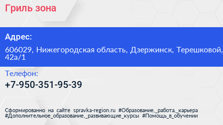 Гриль зона по адресу 606029, Нижегородская область, Дзержинск, Терешковой, 42а/1 в дальнейшем Организация, размещена в следующих категориях: