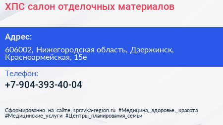 ХПС, салон отделочных материалов по адресу 606002, Нижегородская область, Дзержинск, Красноармейская, 15е в дальнейшем Организация, размещена в следующих категориях: