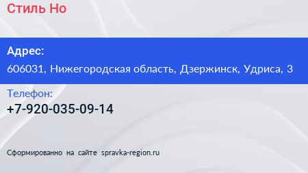 Стиль-Но по адресу 606031, Нижегородская область, Дзержинск, Удриса, 3 в дальнейшем Организация, размещена в следующих категориях: