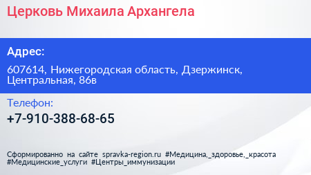 Церковь Михаила Архангела по адресу 607614, Нижегородская область, Дзержинск, Центральная, 86в в дальнейшем Организация, размещена в следующих категориях: