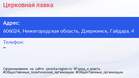 Церковная лавка по адресу 606024, Нижегородская область, Дзержинск, Гайдара, 4 в дальнейшем Организация, размещена в следующих категориях: