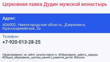 Церковная лавка, Дудин мужской монастырь по адресу 606002, Нижегородская область, Дзержинск, Красноармейская, 2а в дальнейшем Организация, размещена в следующих категориях: