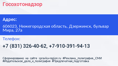 Госохотонадзор по адресу 606023, Нижегородская область, Дзержинск, бульвар Мира, 27а в дальнейшем Организация, размещена в следующих категориях: