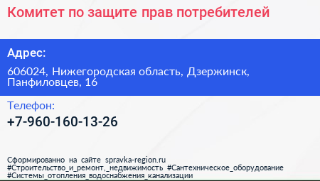 Комитет по защите прав потребителей по адресу 606024, Нижегородская область, Дзержинск, Панфиловцев, 16 в дальнейшем Организация, размещена в следующих категориях: