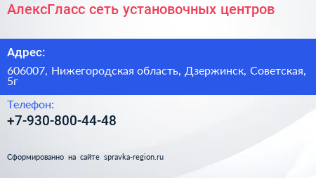 АлексГласс, сеть установочных центров по адресу 606007, Нижегородская область, Дзержинск, Советская, 5г в дальнейшем Организация, размещена в следующих категориях: