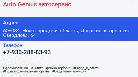 Auto-Genius, автосервис по адресу 606034, Нижегородская область, Дзержинск, проспект Свердлова, 64 в дальнейшем Организация, размещена в следующих категориях:
