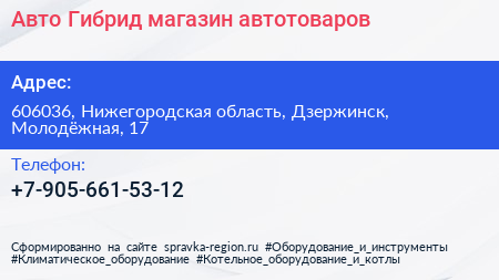Авто-Гибрид, магазин автотоваров по адресу 606036, Нижегородская область, Дзержинск, Молодёжная, 17 в дальнейшем Организация, размещена в следующих категориях: