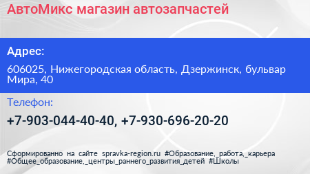 АвтоМикс, магазин автозапчастей по адресу 606025, Нижегородская область, Дзержинск, бульвар Мира, 40 в дальнейшем Организация, размещена в следующих категориях: