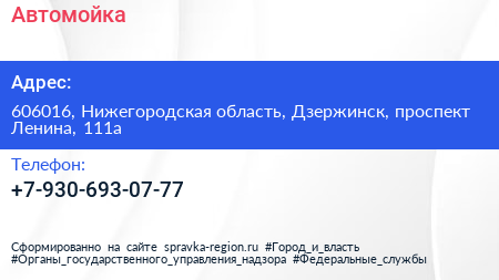 Автомойка по адресу 606016, Нижегородская область, Дзержинск, проспект Ленина, 111а в дальнейшем Организация, размещена в следующих категориях: