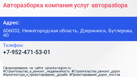 Авторазборка, компания услуг авторазбора по адресу 606032, Нижегородская область, Дзержинск, Бутлерова, 40 в дальнейшем Организация, размещена в следующих категориях: