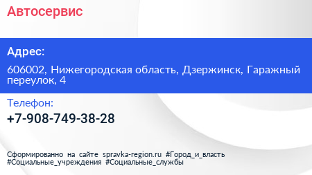 Автосервис по адресу 606002, Нижегородская область, Дзержинск, Гаражный переулок, 4 в дальнейшем Организация, размещена в следующих категориях: