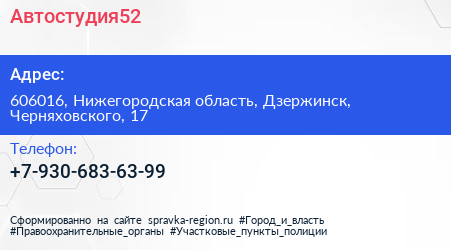 Автостудия52 по адресу 606016, Нижегородская область, Дзержинск, Черняховского, 17 в дальнейшем Организация, размещена в следующих категориях: