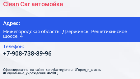 Clean Car, автомойка по адресу Нижегородская область, Дзержинск, Решетихинское шоссе, 4 в дальнейшем Организация, размещена в следующих категориях: