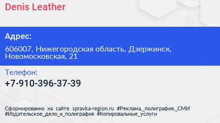 Denis & Leather по адресу 606007, Нижегородская область, Дзержинск, Новомосковская, 21 в дальнейшем Организация, размещена в следующих категориях: