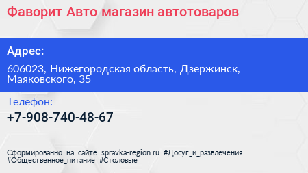 Фаворит-Авто, магазин автотоваров по адресу 606023, Нижегородская область, Дзержинск, Маяковского, 35 в дальнейшем Организация, размещена в следующих категориях: