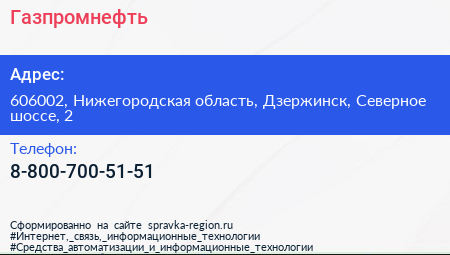 Газпромнефть по адресу 606002, Нижегородская область, Дзержинск, Северное шоссе, 2 в дальнейшем Организация, размещена в следующих категориях: