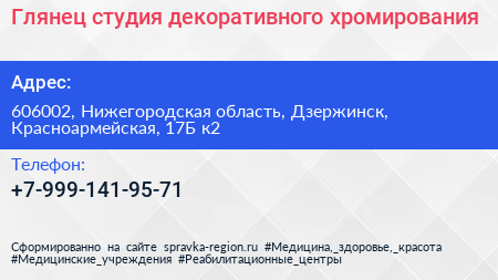 Глянец, студия декоративного хромирования по адресу 606002, Нижегородская область, Дзержинск, Красноармейская, 17Б к2 в дальнейшем Организация, размещена в следующих категориях: