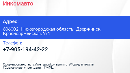 Инкомавто по адресу 606002, Нижегородская область, Дзержинск, Красноармейская, 9/1 в дальнейшем Организация, размещена в следующих категориях: