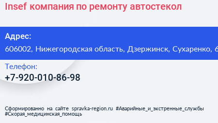 Insef, компания по ремонту автостекол по адресу 606002, Нижегородская область, Дзержинск, Сухаренко, 6 в дальнейшем Организация, размещена в следующих категориях: