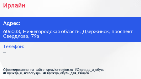 Ирлайн по адресу 606033, Нижегородская область, Дзержинск, проспект Свердлова, 79а в дальнейшем Организация, размещена в следующих категориях: