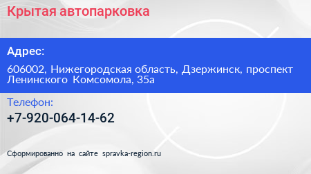 Крытая автопарковка по адресу 606002, Нижегородская область, Дзержинск, проспект Ленинского Комсомола, 35а в дальнейшем Организация, размещена в следующих категориях: