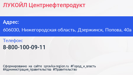 ЛУКОЙЛ-Центрнефтепродукт по адресу 606030, Нижегородская область, Дзержинск, Попова, 40а в дальнейшем Организация, размещена в следующих категориях: