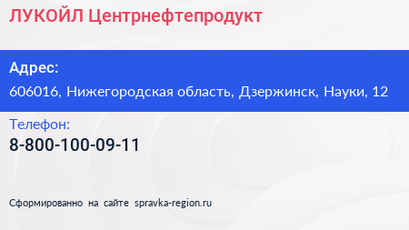 ЛУКОЙЛ-Центрнефтепродукт по адресу 606016, Нижегородская область, Дзержинск, Науки, 12 в дальнейшем Организация, размещена в следующих категориях: