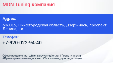 MDN-Tuning, компания по адресу 606015, Нижегородская область, Дзержинск, проспект Ленина, 1а в дальнейшем Организация, размещена в следующих категориях: