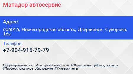 Матадор, автосервис по адресу 606016, Нижегородская область, Дзержинск, Суворова, 16а в дальнейшем Организация, размещена в следующих категориях: